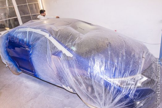 Les premières photos montrent les différentes étapes d’une remise en état d’une carrosserie.